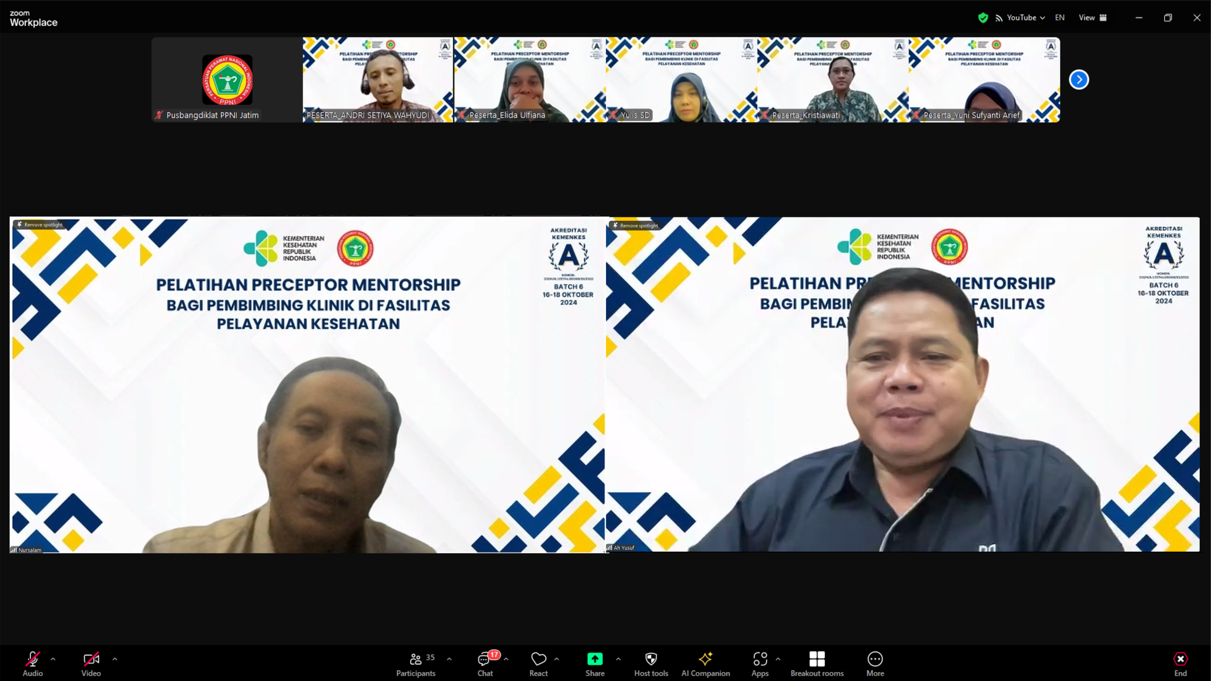 Surabaya, 16 Oktober 2024 – Pelatihan Preceptorship & Mentorship Batch ke-6 yang diselenggarakan oleh Pusat Pengembangan Pendidikan dan Pelatihan (Pusbangdiklat) PPNI DPW Provinsi Jawa Timur resmi dibuka hari ini. Acara ini diadakan secara daring melalui platform Zoom Meeting selama tiga hari, mulai tanggal 16 hingga 18 Oktober 2024. Sebanyak 30 peserta yang terdiri dari dosen dan tenaga pengajar Fakultas Keperawatan Universitas Airlangga (UNAIR) Surabaya turut berpartisipasi dalam pelatihan ini.