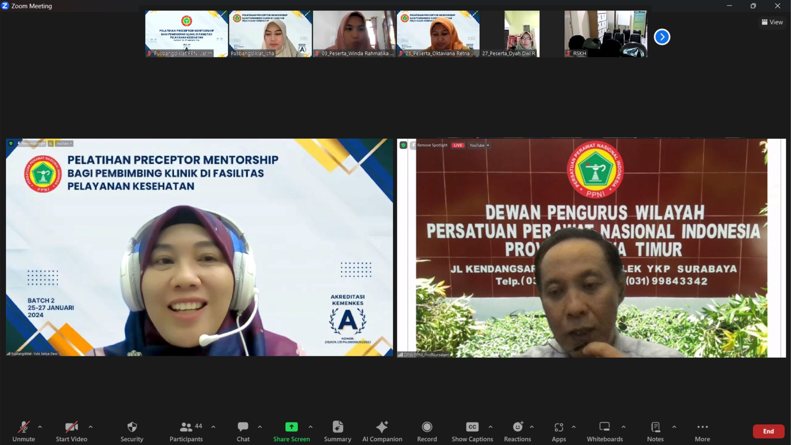 Pelatihan Preceptorship mentorship Batch 2 Bagi Pembimbing Klinik di Fasilitas Pelayanan Kesehatan resmi dibuka hari ini, Selasa, 25 Januari 2024, melalui zoom meeting. Pelatihan ini diselenggarakan oleh DPW PPNI Jawa Timur.