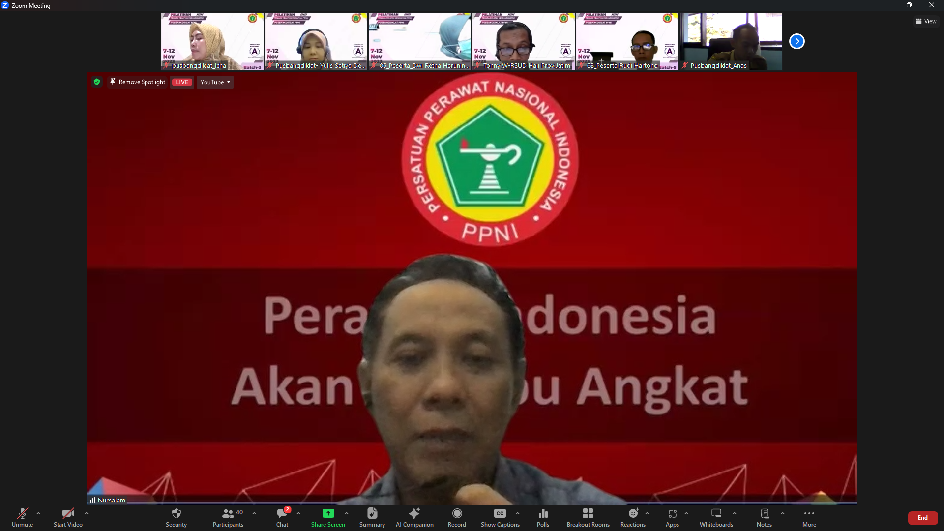Surabaya, 7 November 2023 – Pusat Pengembangan dan Pendidikan Tenaga Kesehatan (PUSBANGDIKLAT) Persatuan Perawat Nasional Indonesia (PPNI) Jawa Timur membuka pelatihan tenaga pelatih kesehatan (TPK) batch 5 secara daring melalui zoom meeting pada hari ini, Selasa (7/11/2023).