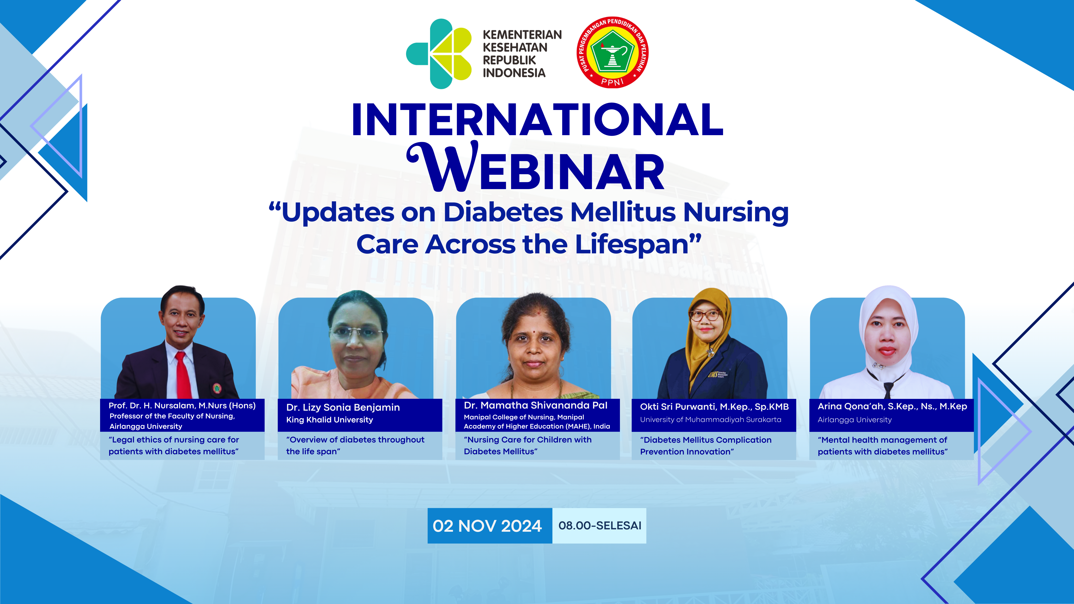- Prof. Dr. H. Nursalam, M.Nurs (Hons), Ketua DPW PPNI Jawa Timur, membawakan materi “Legal ethics of nursing care for patients with diabetes mellitus.” Dalam paparannya, Prof. Nursalam menekankan pentingnya etika legal dalam memberikan perawatan pada pasien diabetes melitus.