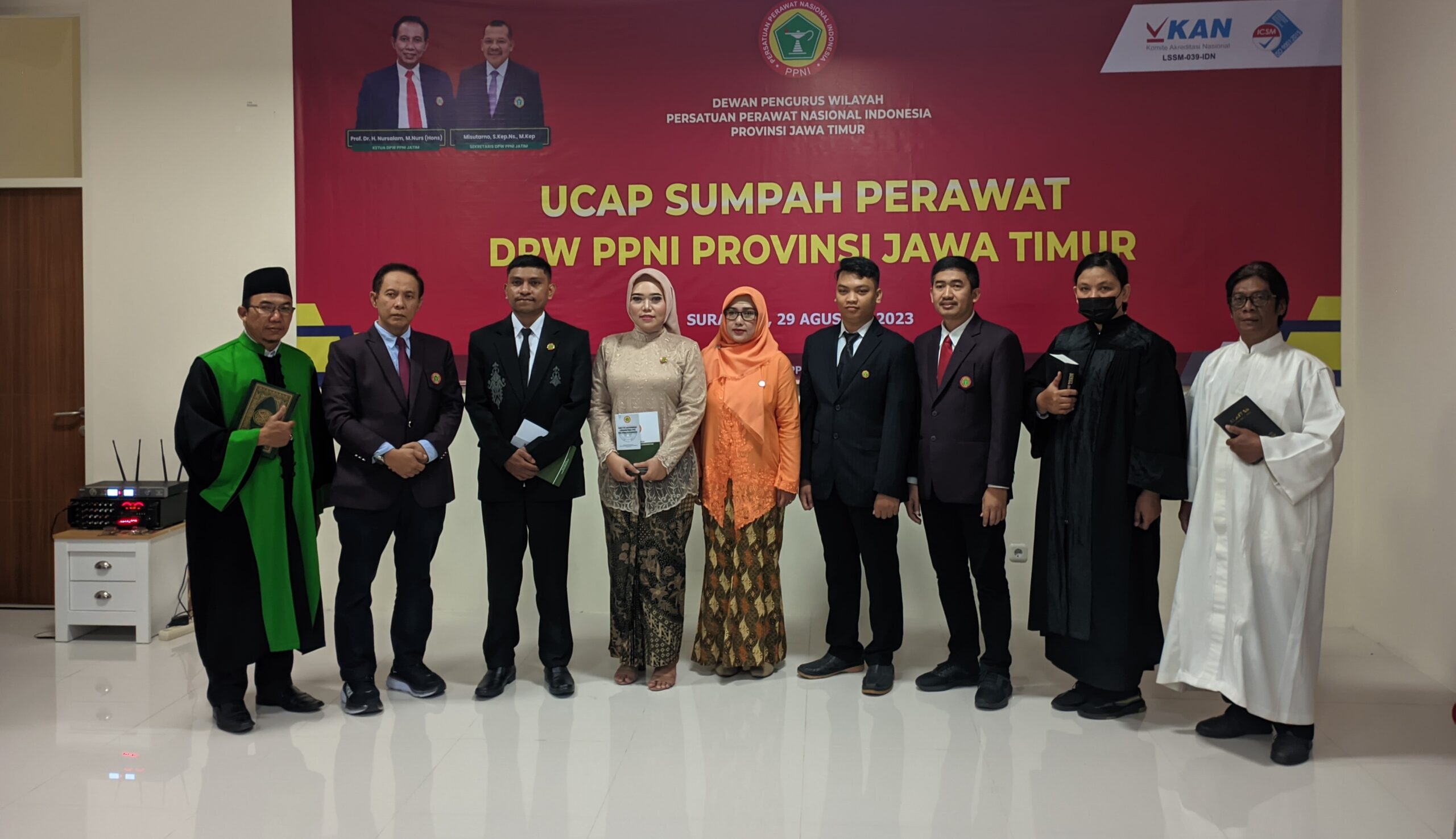 Dewan Pengurus Wilayah Persatuan Perawat Nasional Indonesia (DPW PPNI) Jawa Timur menggelar pengambilan sumpah perawat baru secara hybrid pada Selasa, 29 Agustus 2023. Acara ini diikuti oleh 29 perawat yang berasal dari berbagai wilayah di Indonesia, 4 perawat hadir secara offline di GRHA DPW PPNI Provinsi Jawa Timur dan sisanya hadir secara online menggunakan zoom meeting.